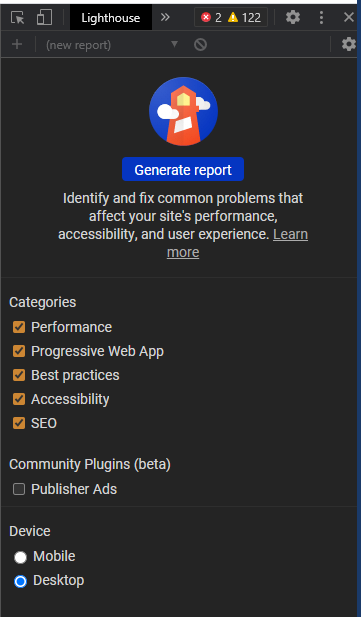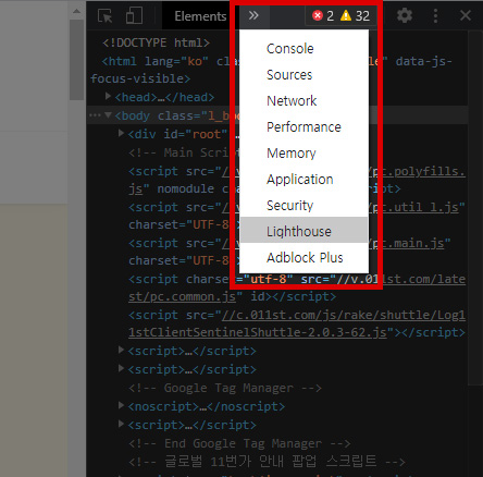 Element 옆에 >> 버튼을 눌러서 Lighthouse 탭으로 이동해주세요.