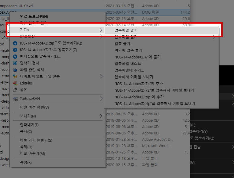 dmg 파일 마우스 오른쪽버튼을 누르면 7-zip이 보일겁니다.