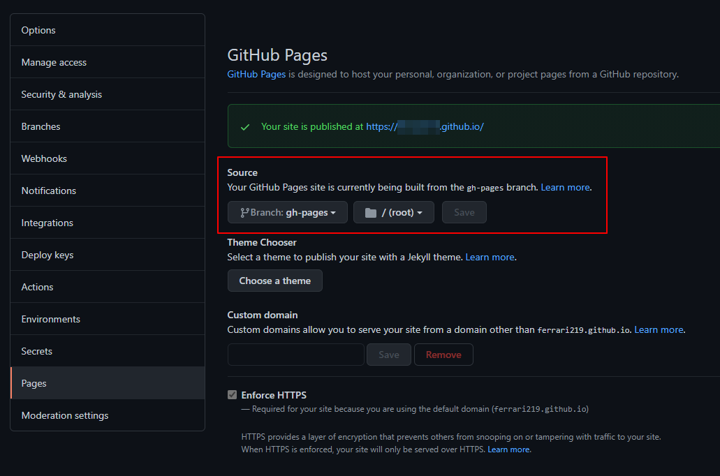그리고 좌측메뉴에서 Pages를 선택하고 나면 윗쪽에 내 사이트 주소가 나오고 source쪽에 Branch: gh-pages로 설정되었는지 확인해줍니다.
