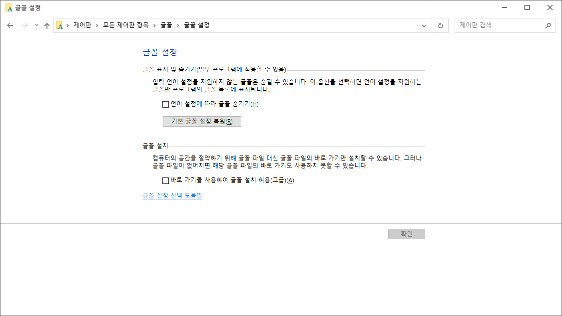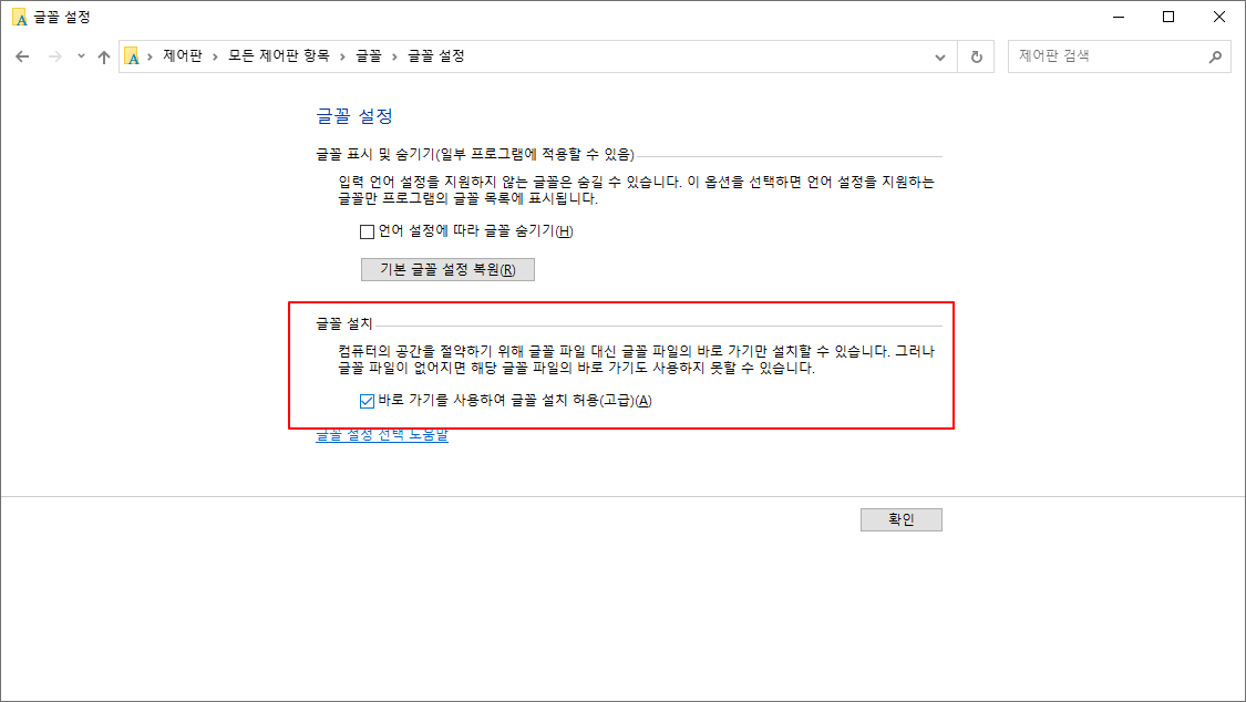 - 바로 가기를 사용하여 글꼴 설치 허용(고급) 체크