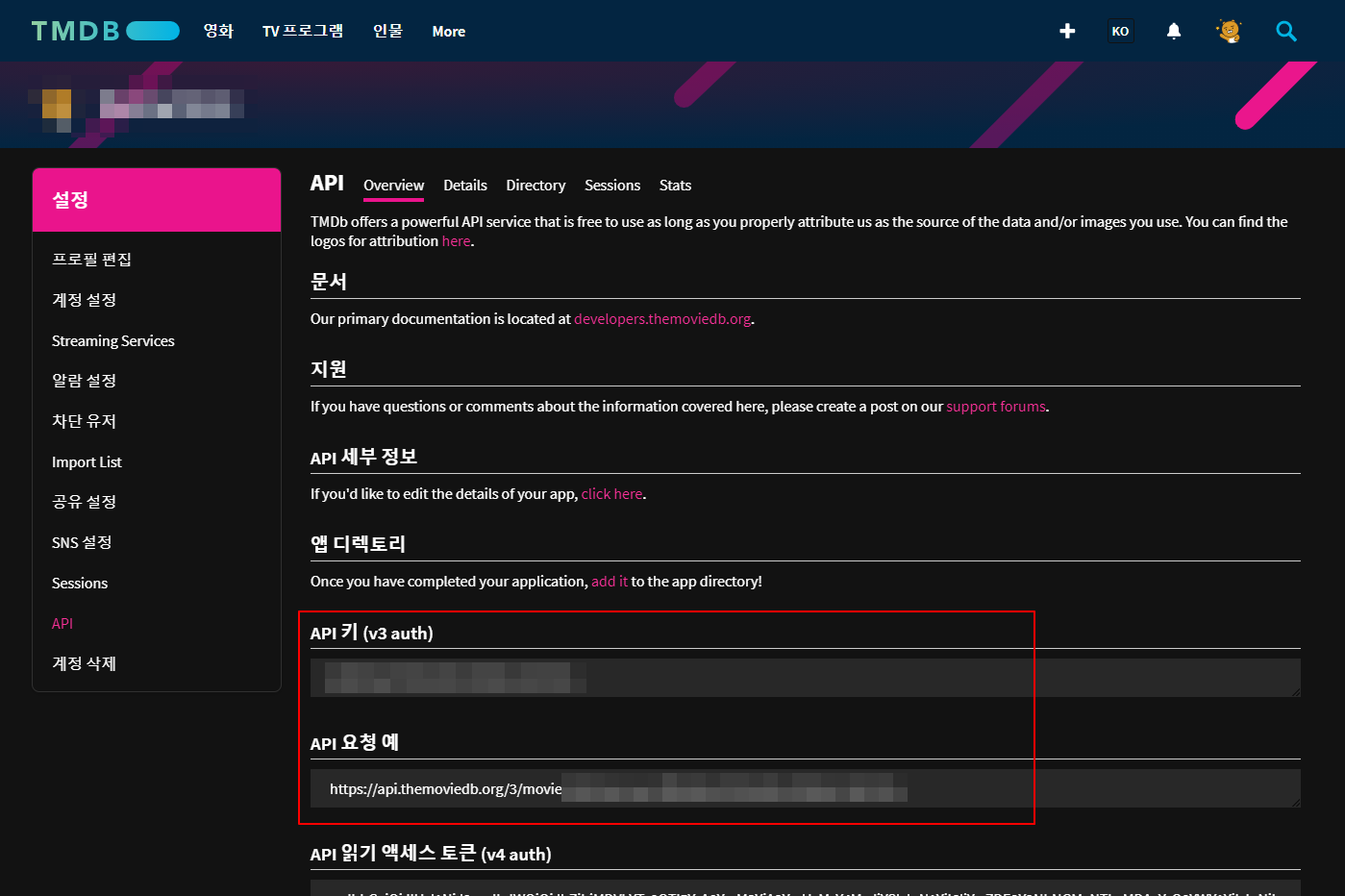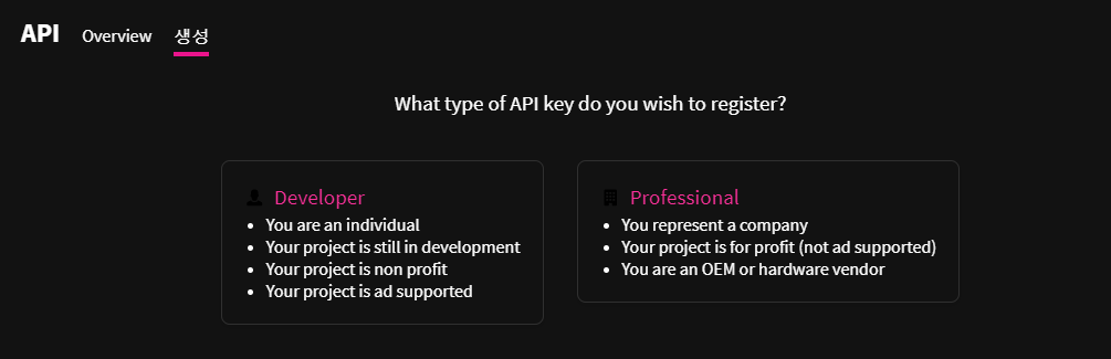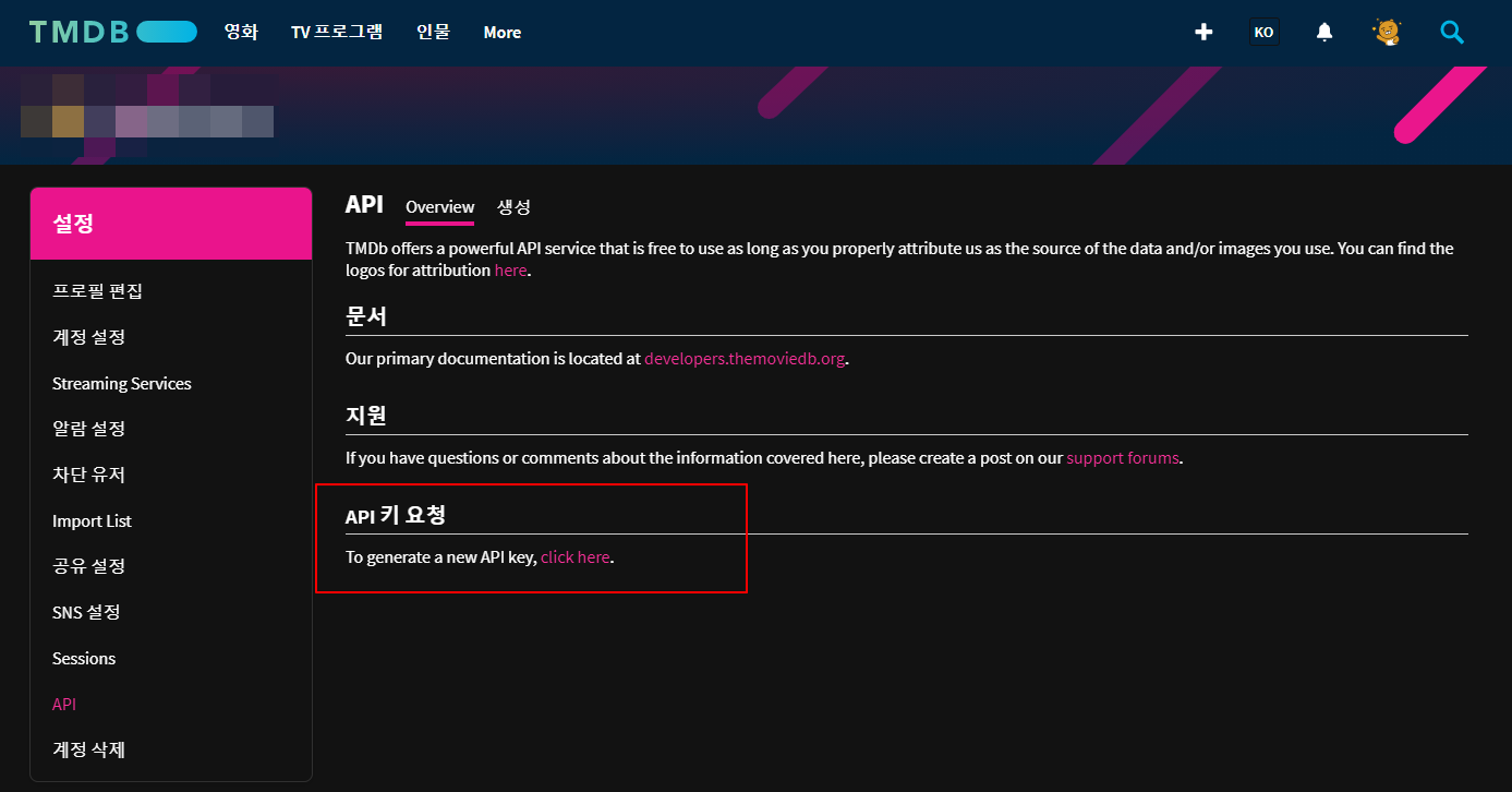 - 이제 내 설정에 들어가보면 나만의 API 키 를 요청할 수 있습니다.