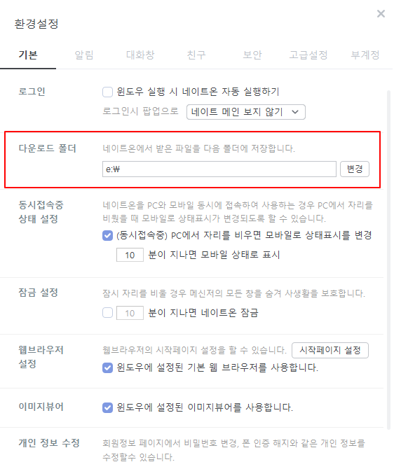 3.네이트온 : 환경설정 > 기본탭 > 다운로드 폴더 변경