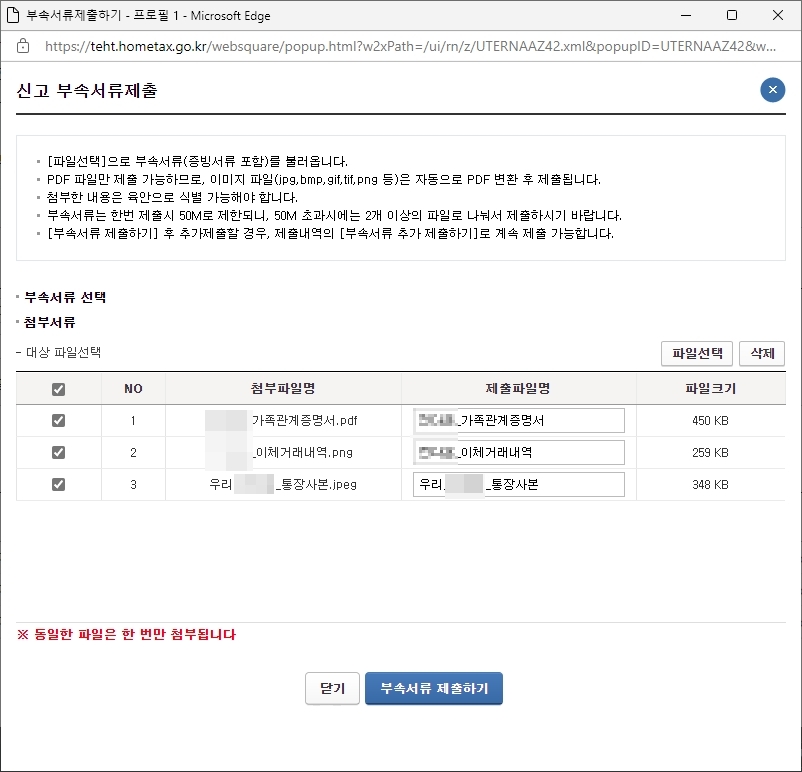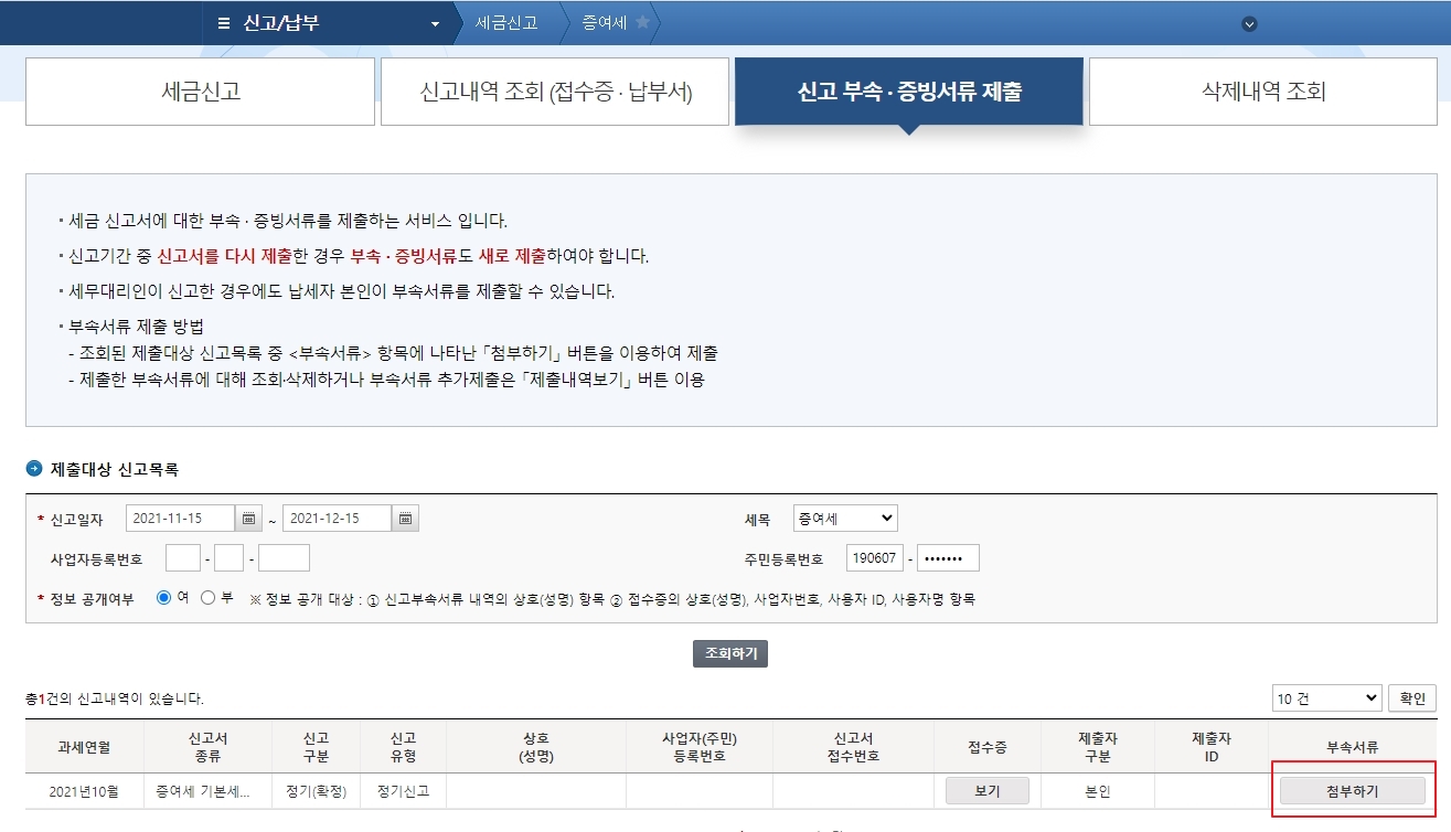 신고 부속 증빙서류 제출