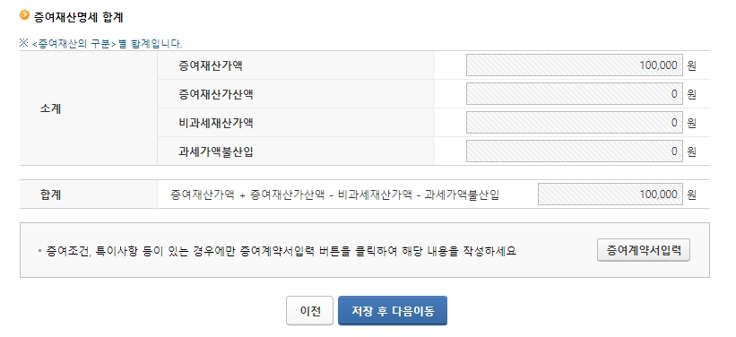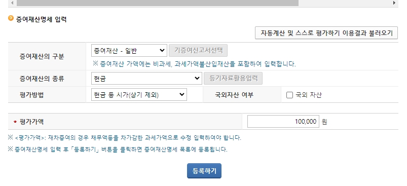 평가가액에는 증여한 액수를 입력합니다.