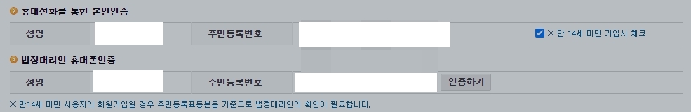 휴대전화를 누르시고 14세 미만을 체크해주세요.