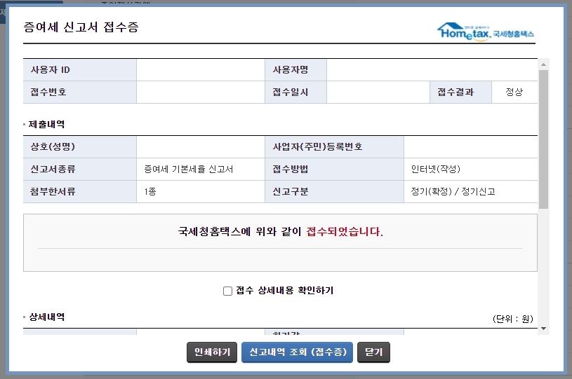 이제 신고서 제출버튼을 누르시면 팝업이 뜹니다.