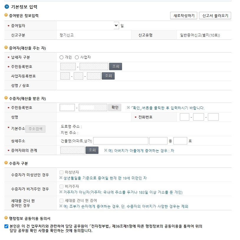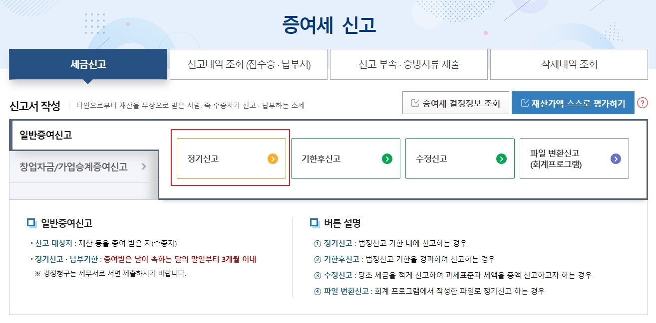 일반증여신고>정기신고를 들어갑니다.