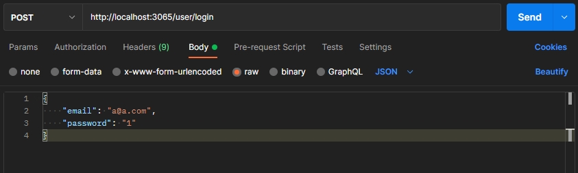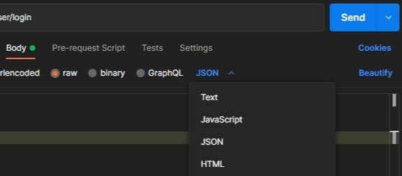 저흰 req.body 에 값을 넣어 줄거니까 Body > raw > JSON을 선택해줍니다.