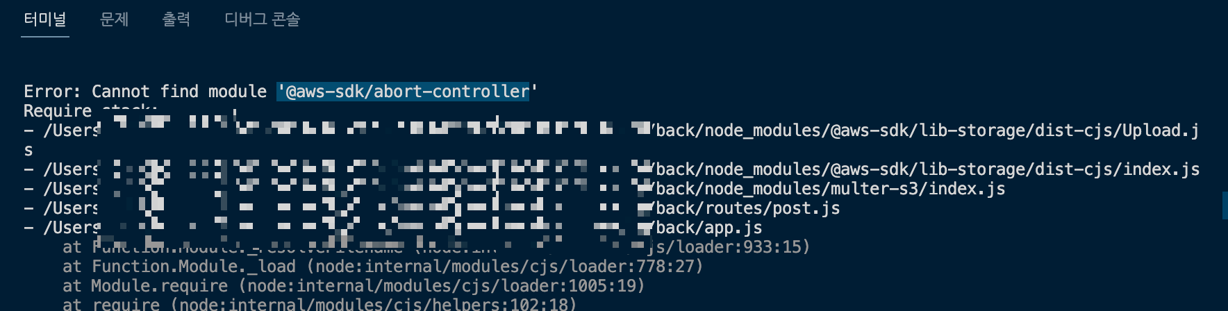 분명히 aws-sdk도 설치했는데, 왜 모듈을 찾을수 없다고 나올까요?